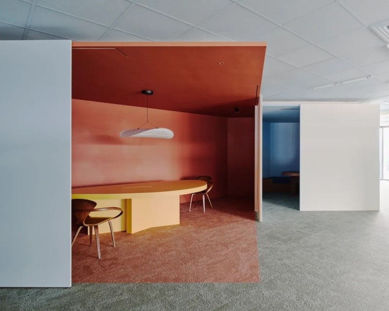 在假期國際的辦公空間設計邏輯中,設計師拋開辦公室點到點、格狀切割空間的形式,改以回繞、非定向的空間路線制造蜿蜒,讓使用者行走間對環境產生「探索」之感,而非傳統僅求效率、壓縮個體感受的工作環境。設計師希望透過回繞行走,即使座位至茶水間的片刻都能讓緊湊生活得到喘息節奏,如同自我療愈的儀式。